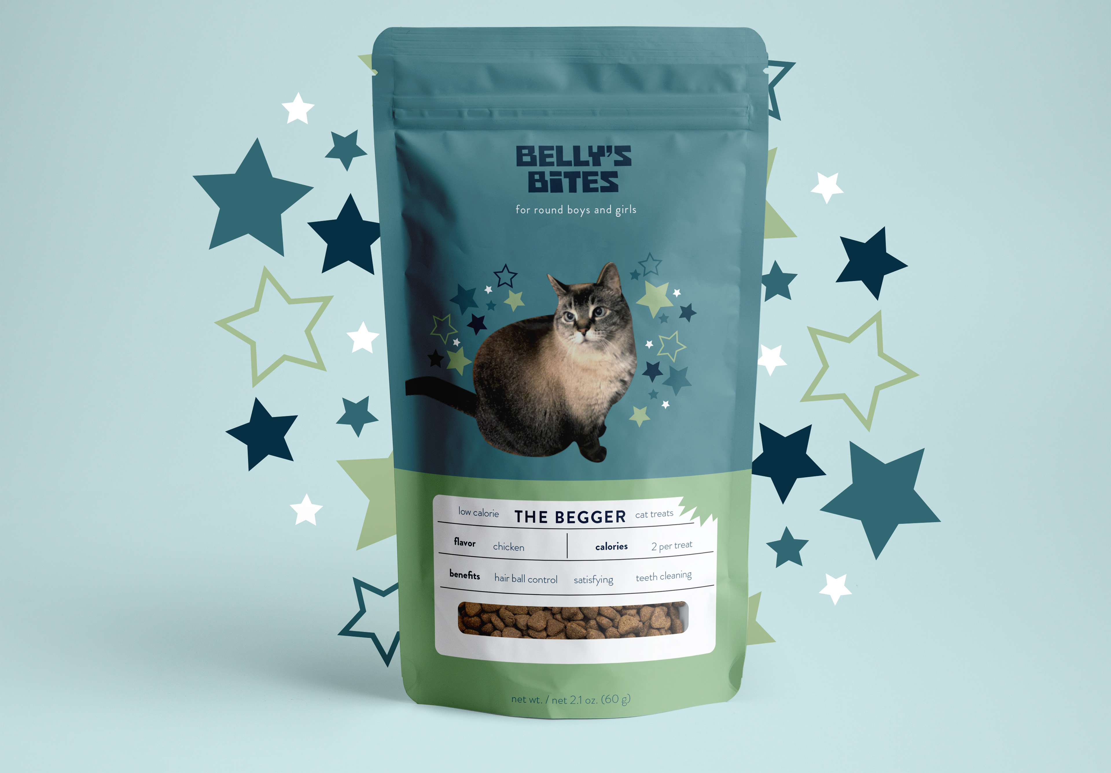 Belly's Bites is a concept brand of cat food for fat cats. As a cat lover I try to appreciate and love the cats that don't get as much love so in 2018 I adopted my cat Belly who was 10 years old and severely overweight (and super cute.) So I sought out to control Belly's diet and in my search for a good diet cat food I noticed that all of the cat foods on the market currently only have skinny cat models on the packaging which... didn't make sense to me? 58% percent of cats are overweight, so Belly's Bites aims to bring attention to this growing issue.